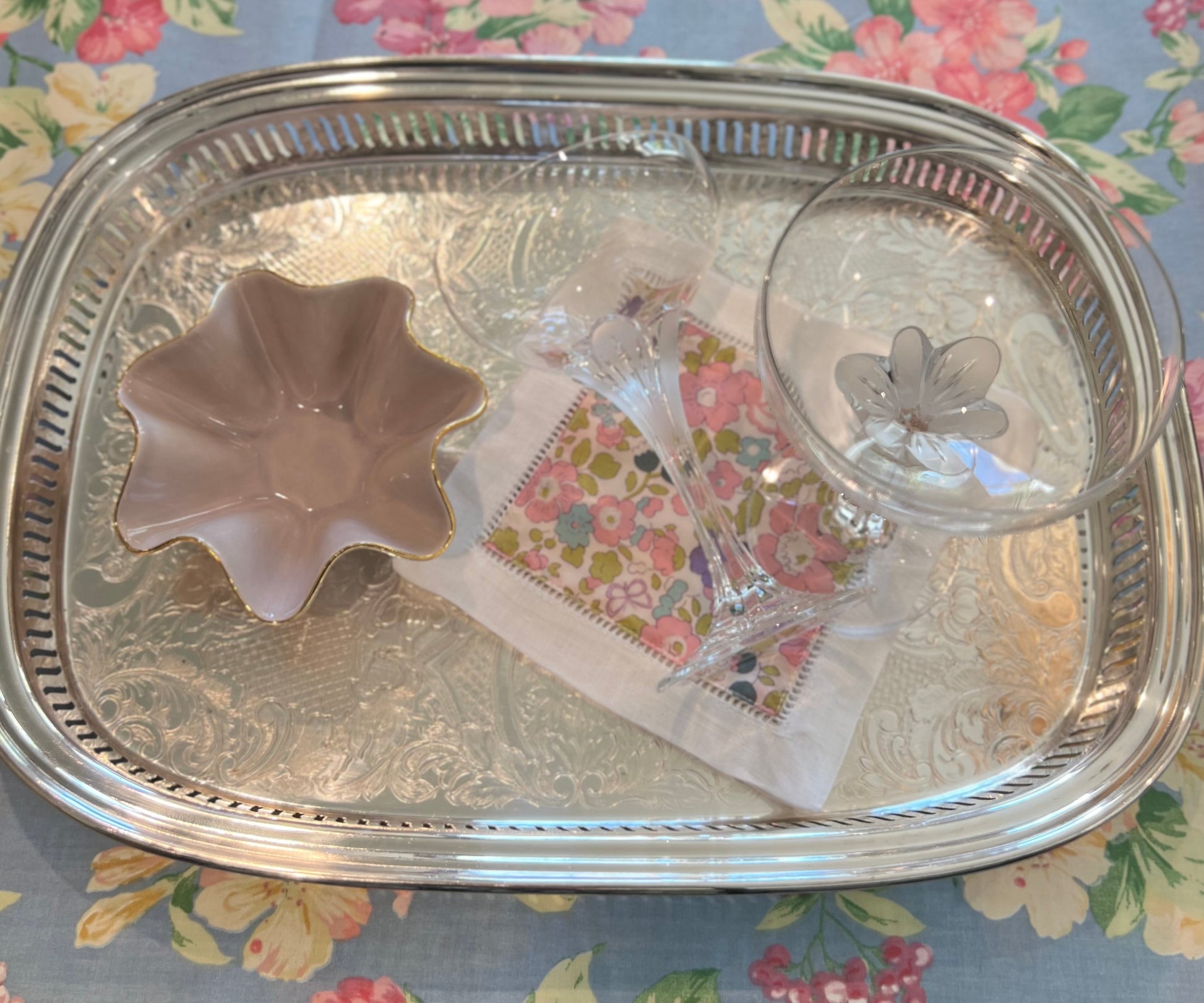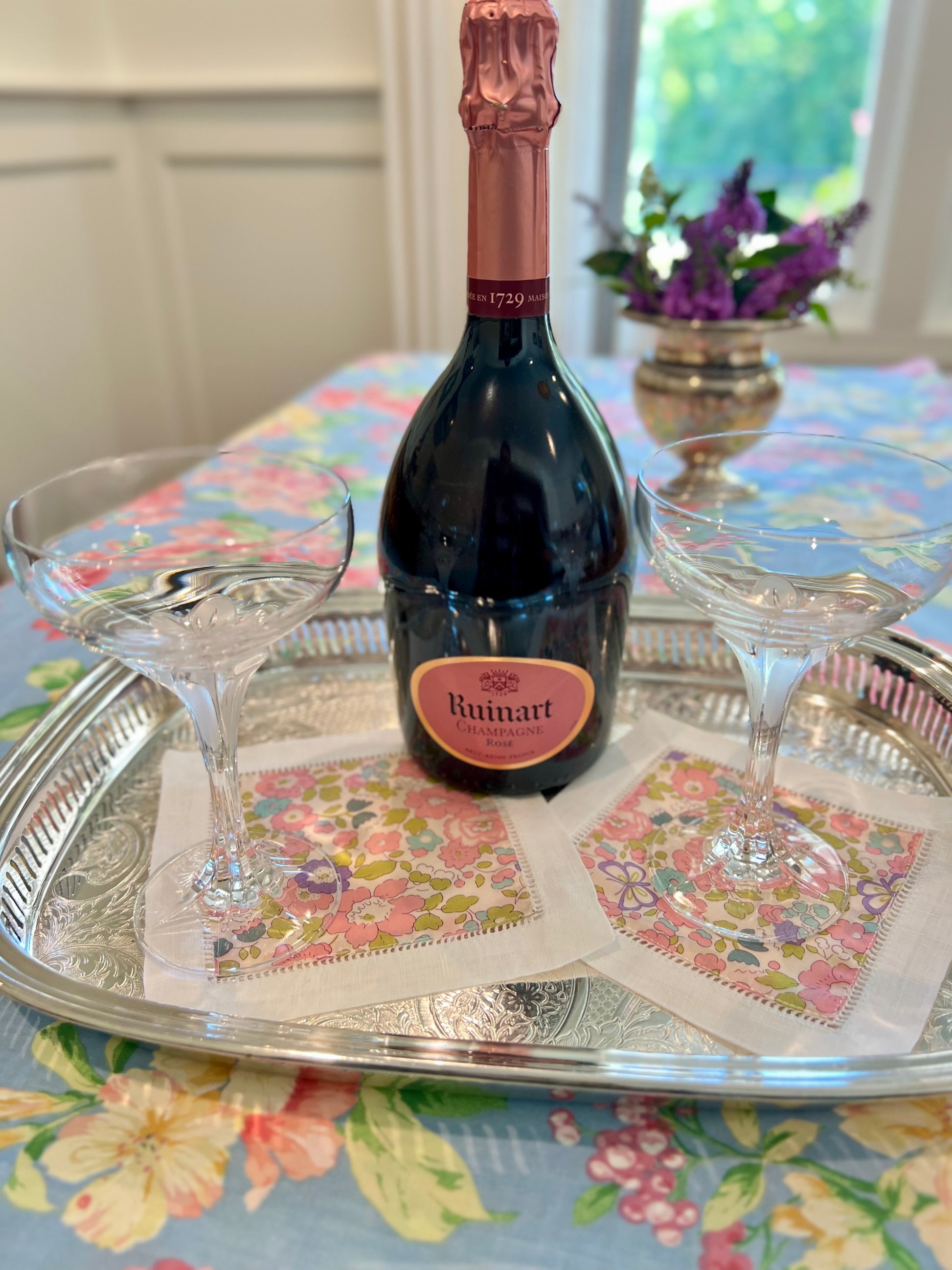 Paired with these timeless glasses is a set of Liberty of London cocktail napkins, with a bright floral print.