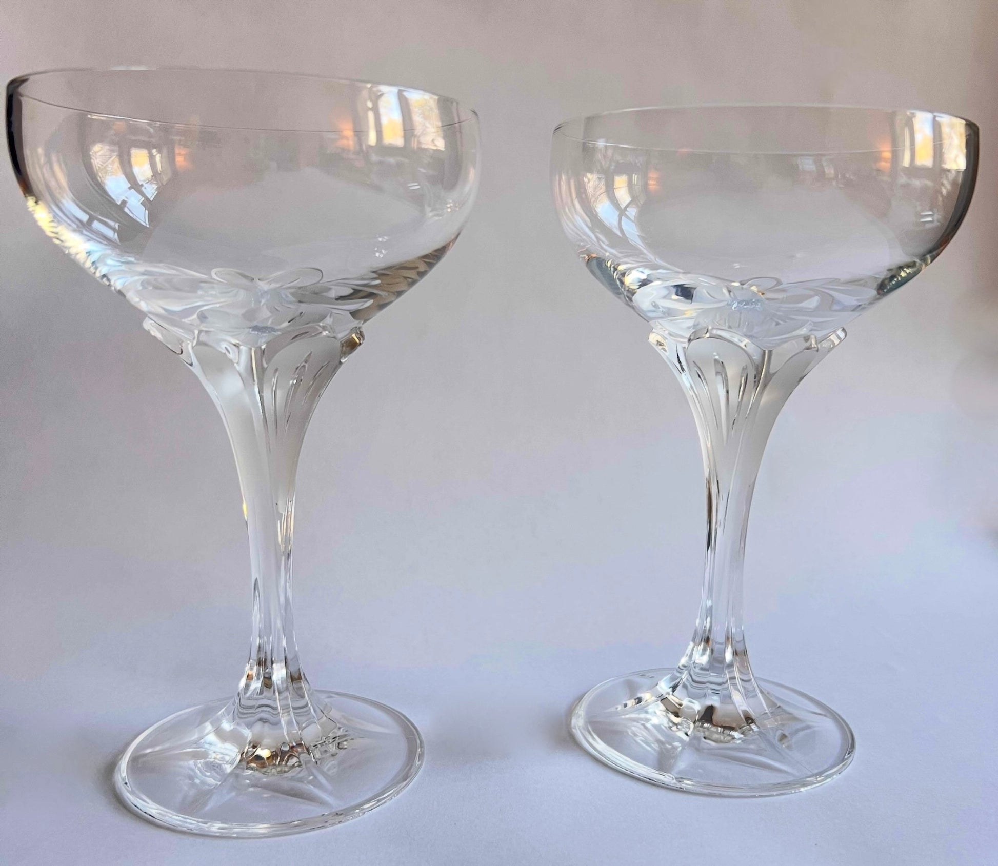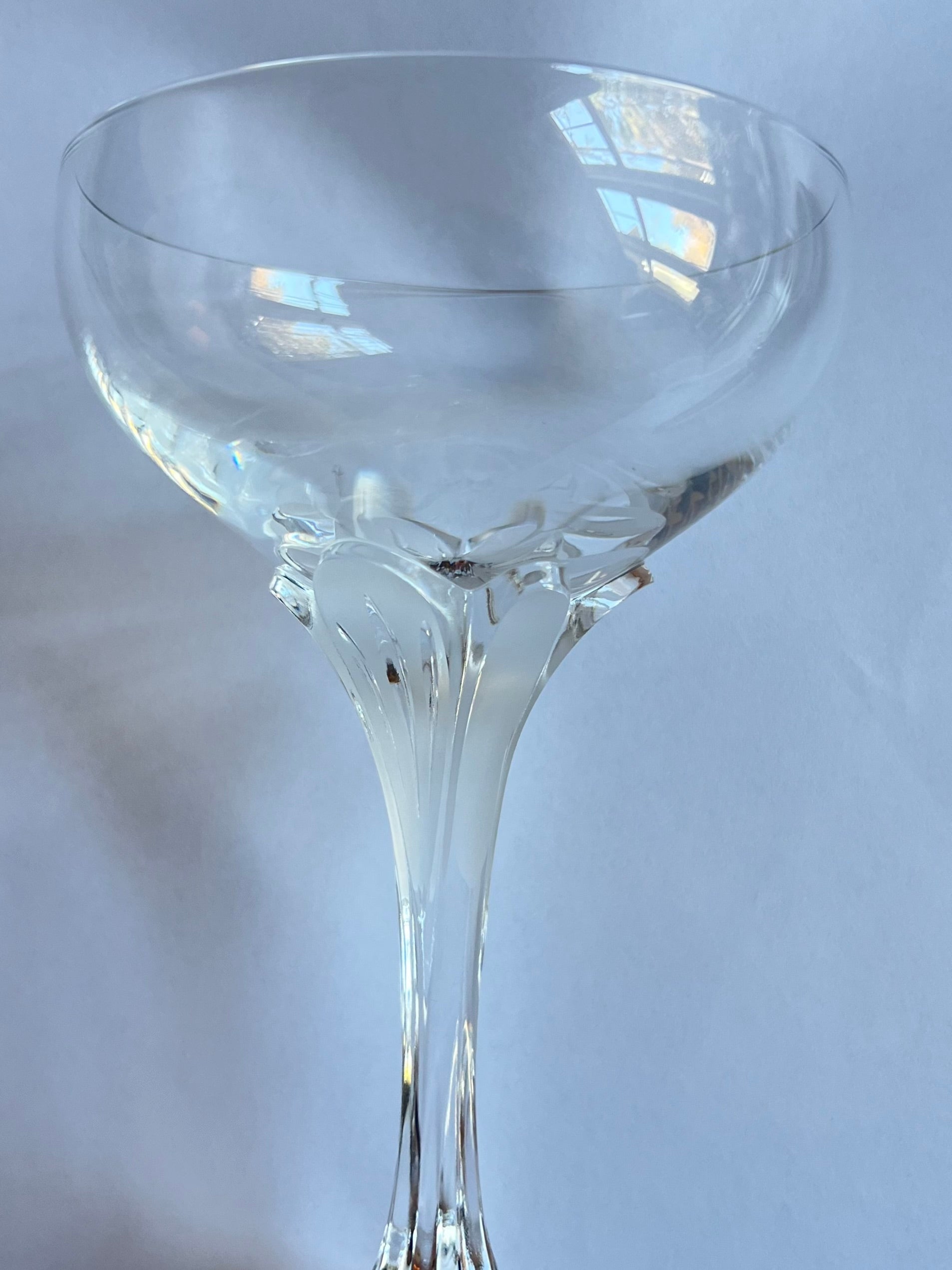 This curated set features a pair of stunning, belle epoque vintage champagne coupes, with a frosted crystal detail and floral stem design.