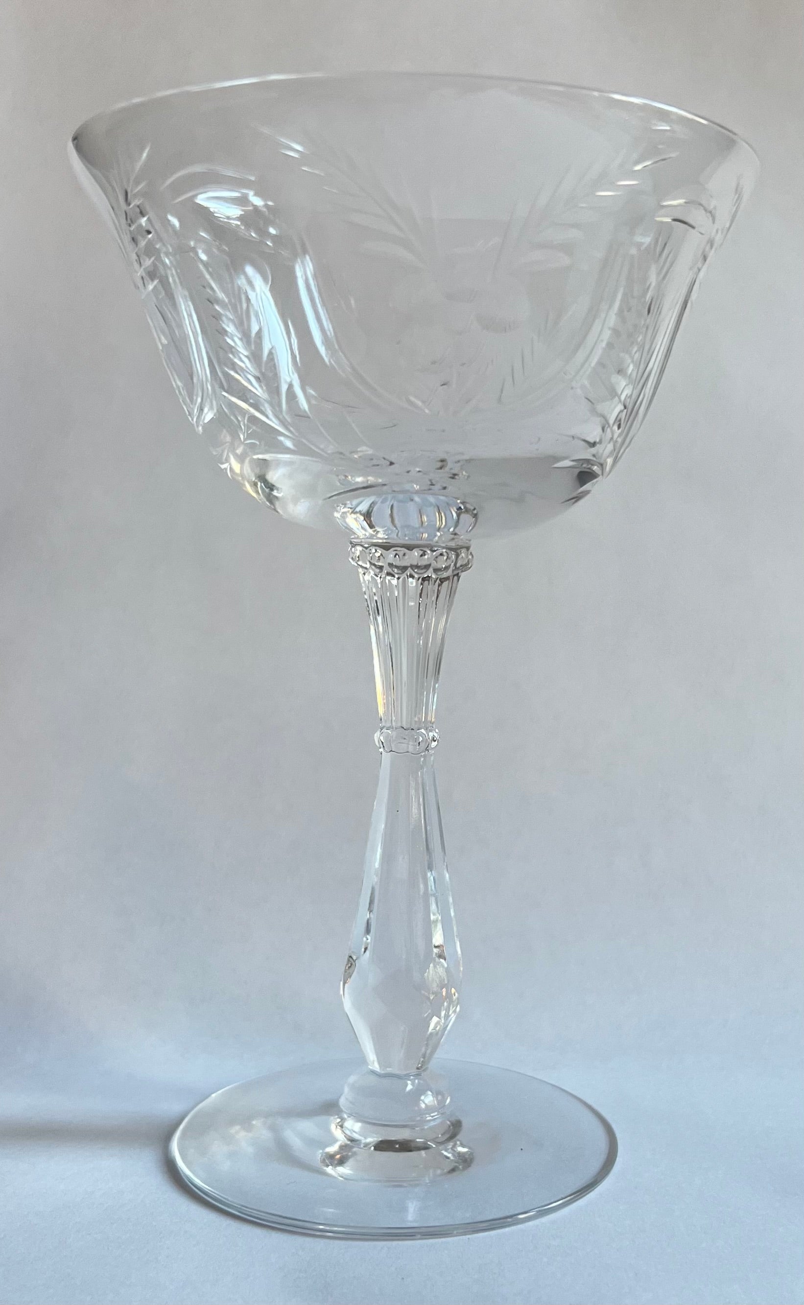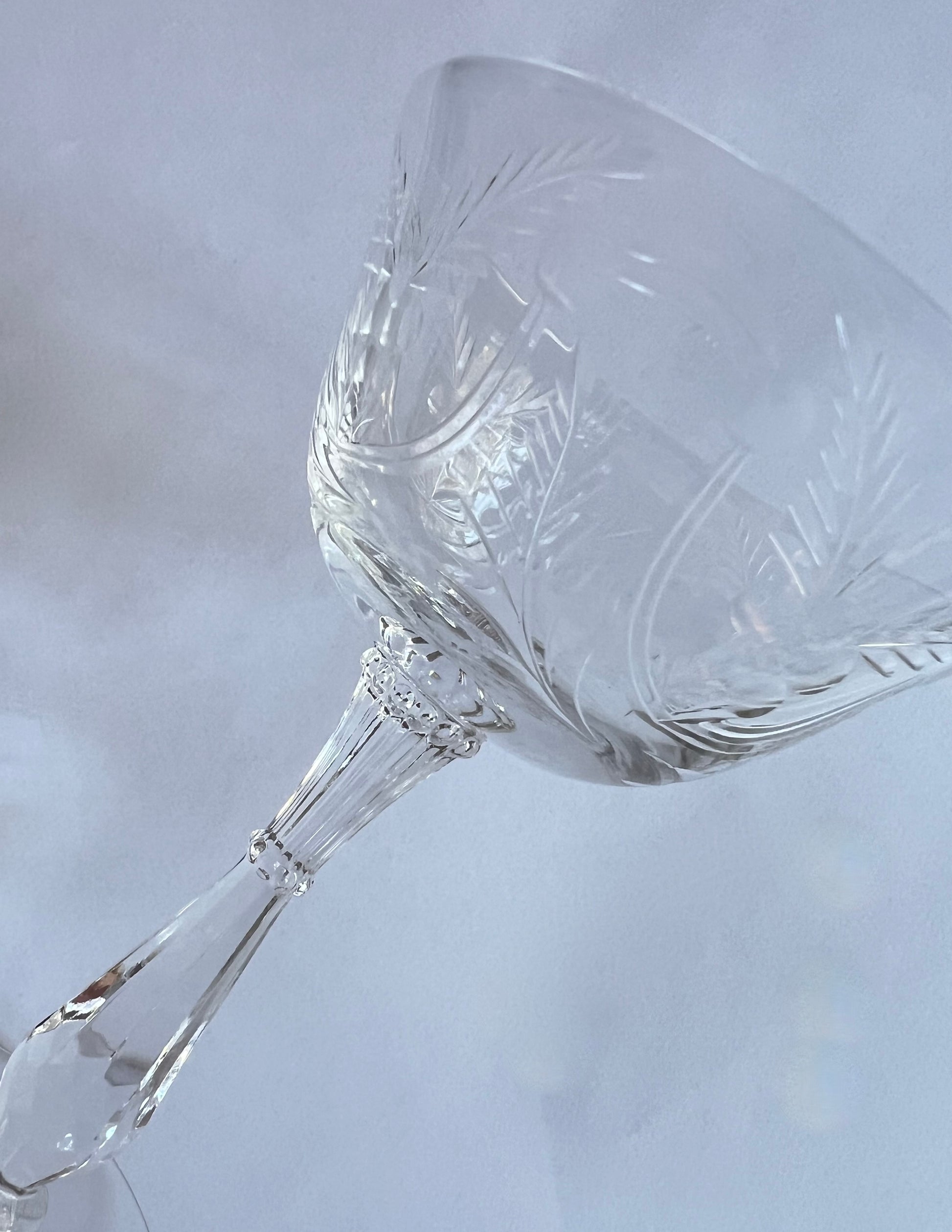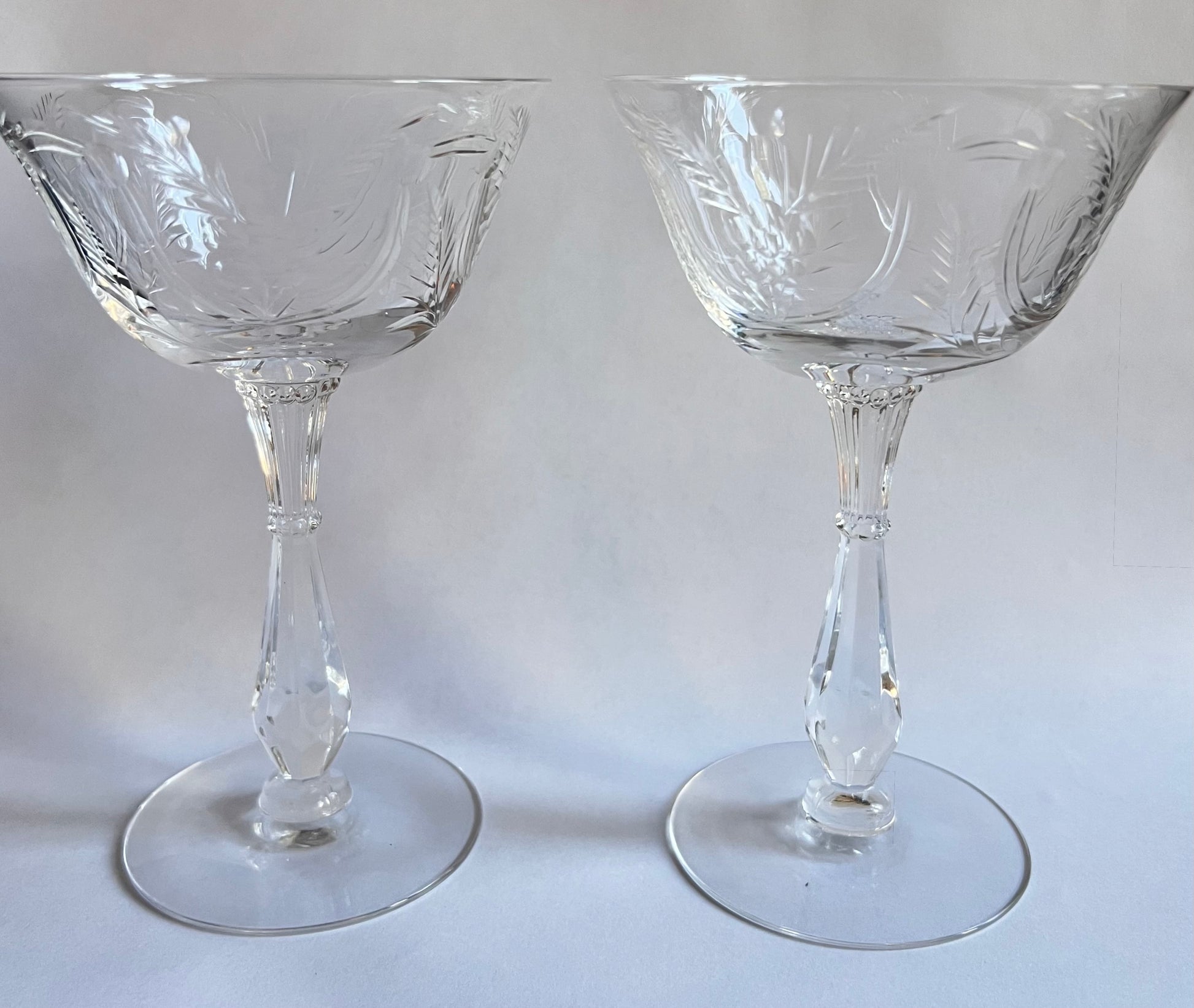 This curated set features a pair of exquisite vintage champagne coupes, delicately etched with intricate floral motifs, perfect for toasting life’s most cherished moments.