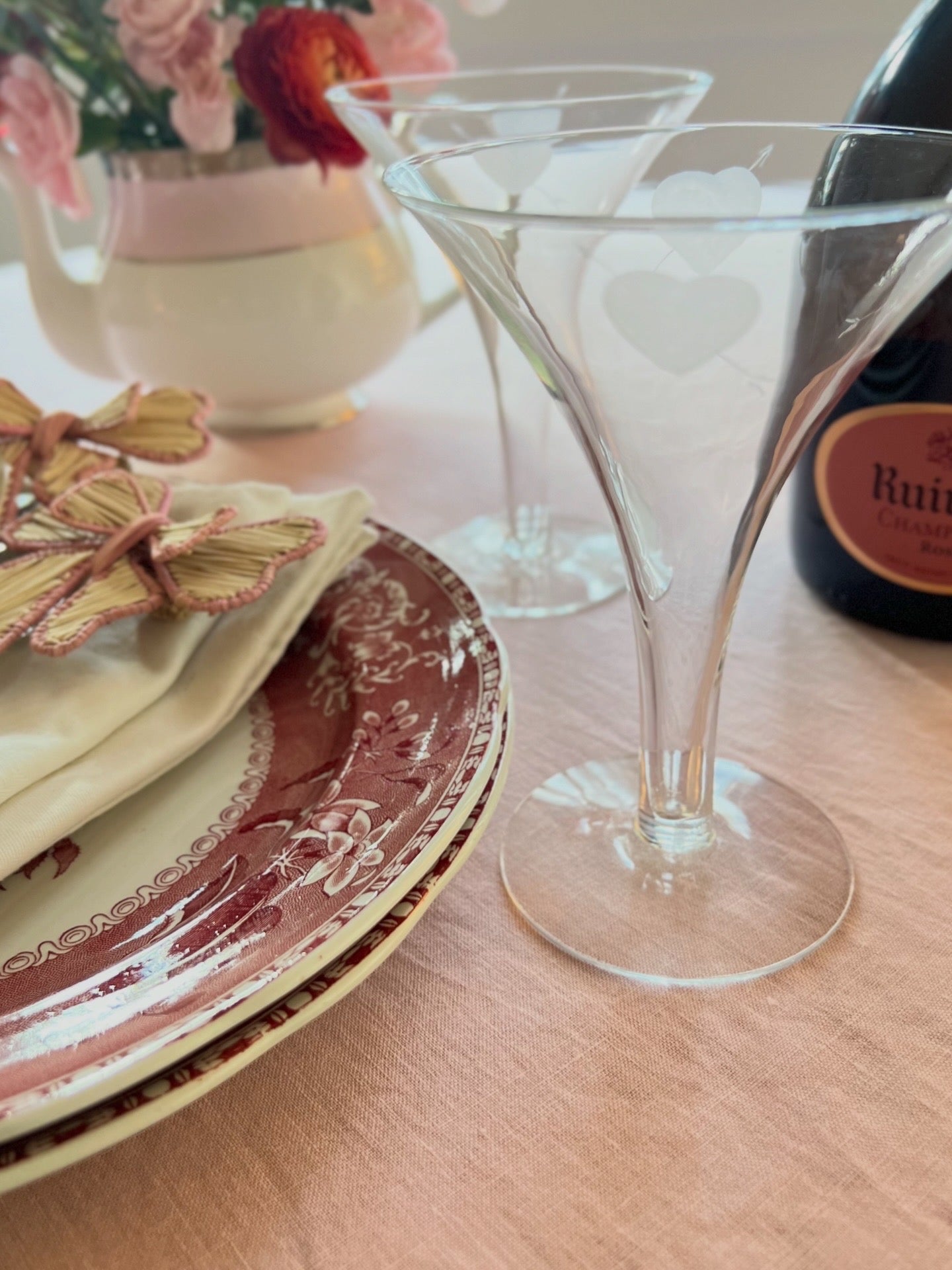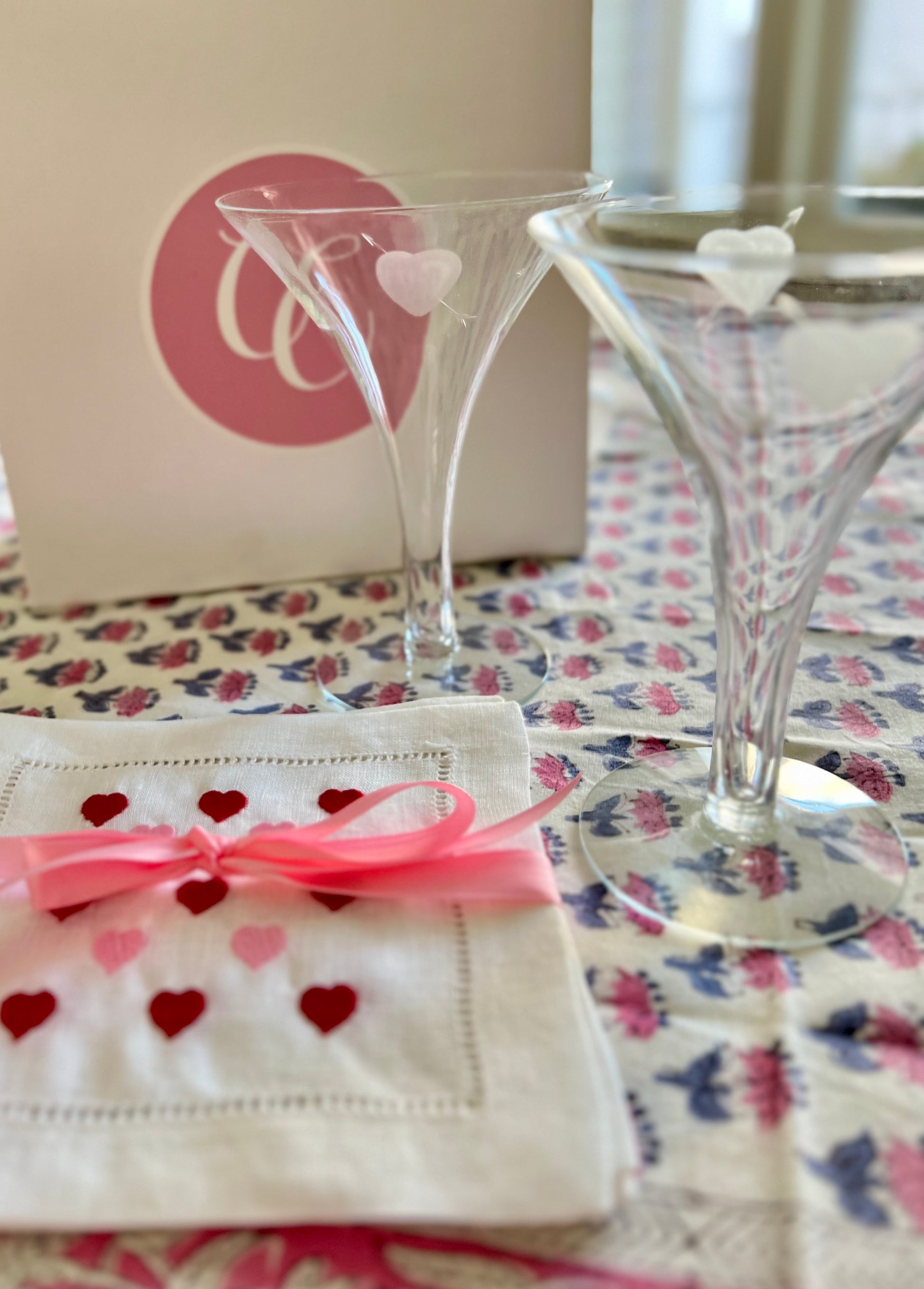 *Set of two vintage, hollow stem coupe glasses etched with a heart/arrow detail