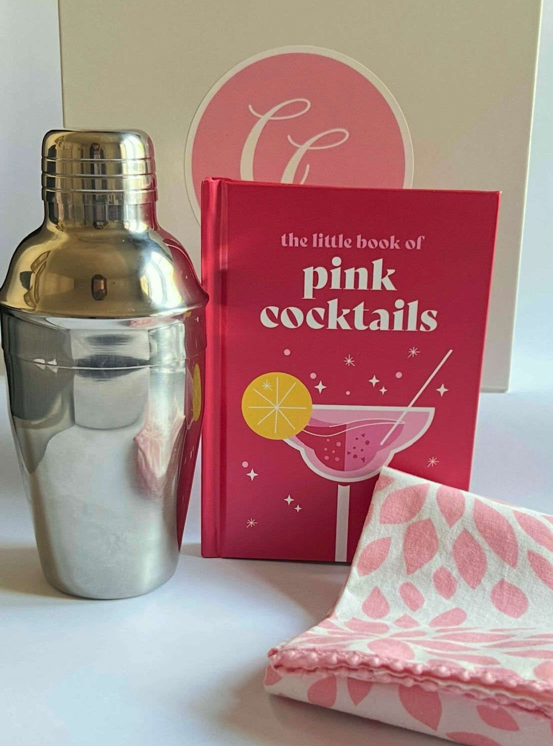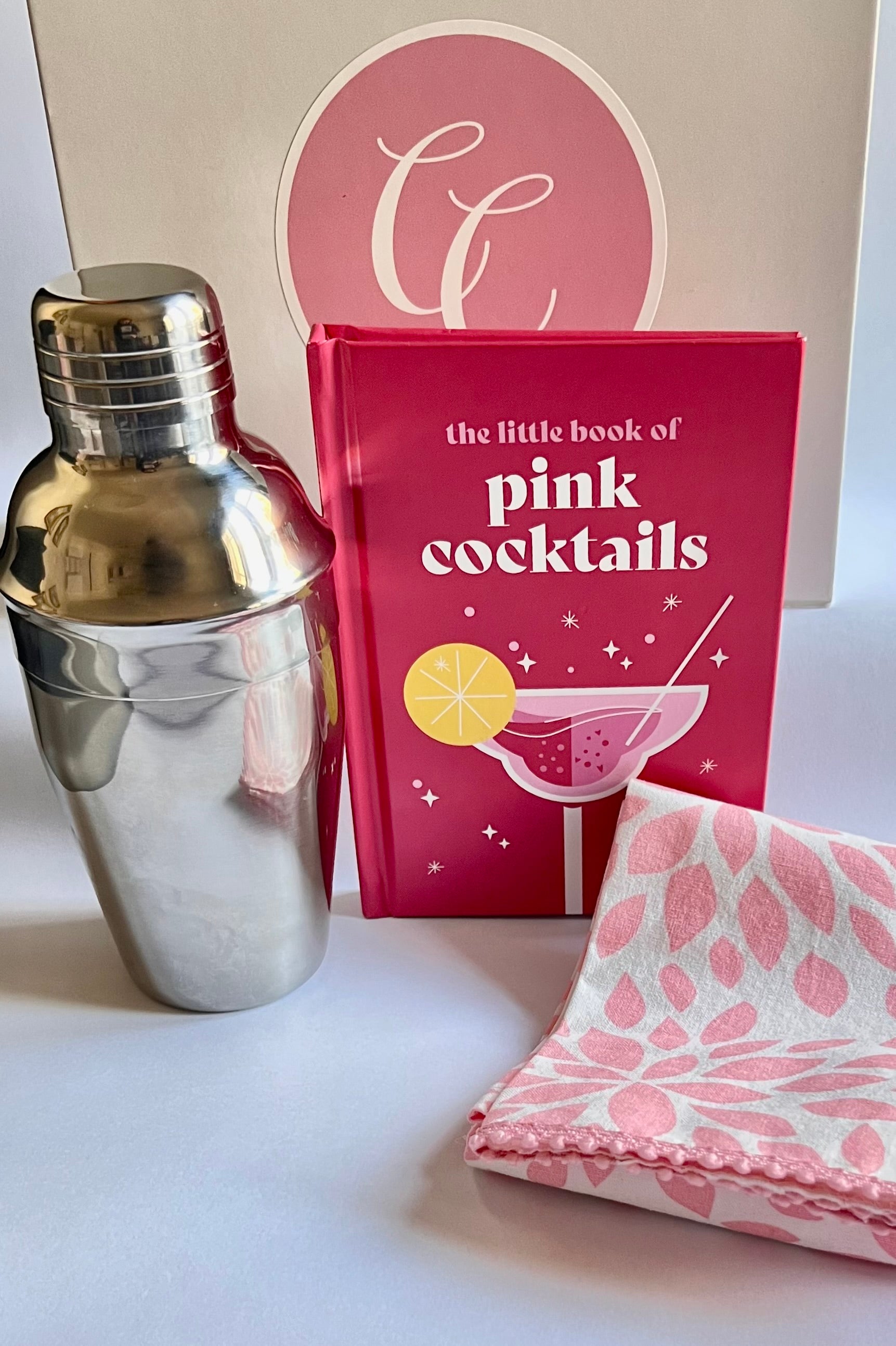 Wrapped and Ready! This pink inspired gift is perfect for a hostess gift, secret santa, or any pink lover in your life. This set includes a cocktail recipe book, a pink and white bar towel with pink trim and a vintage mini cocktail shaker. Cheers!